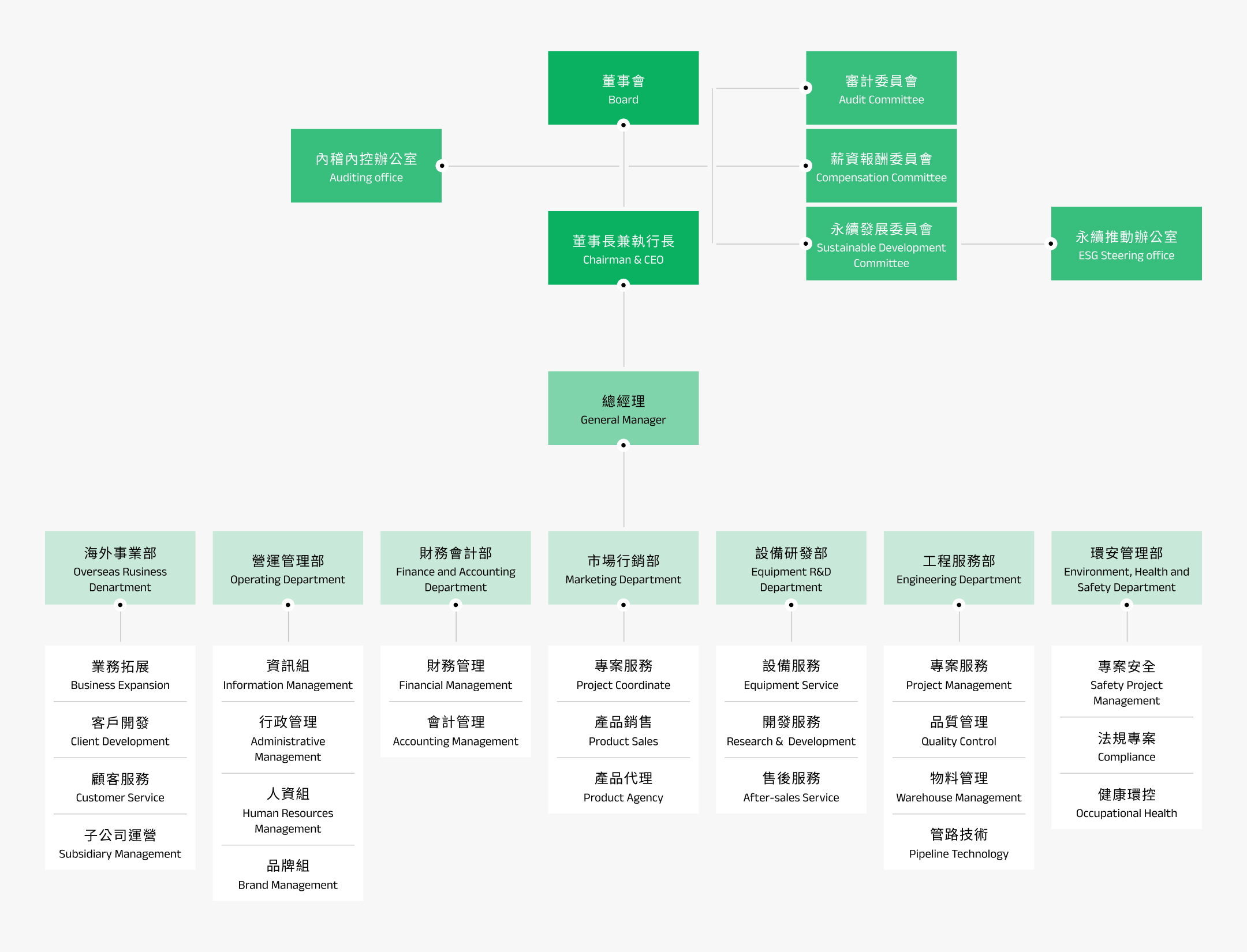 聚賢研發於臺灣北、中、南均設有服務辦公室,此外為因應市場的變化,於營運透明的同時亦能提供安全高效率的產品給客戶,目前於董事會下設有內稽內控辦公室、薪資報酬委員會、永續推動辦公室,並於總經理下設立七大部門,分別處理本公司財務績效、客戶關係管理、開發綠色產品以及供應商管理等事務。