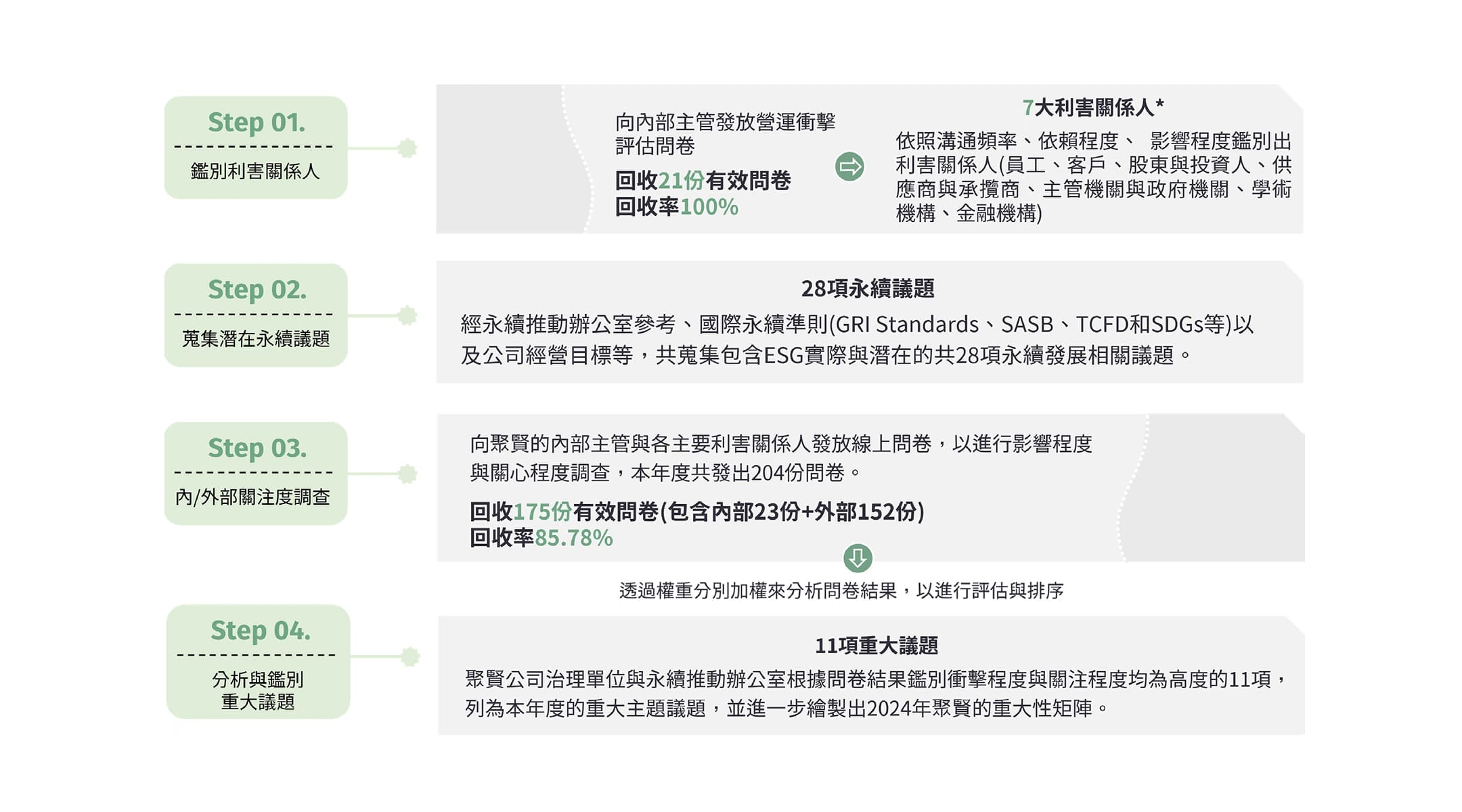 聚賢依循國際永續標準與最新發展趨勢, 參考 GRI Standards 2021、 SASB 永續會計標準、SDGs 永續發展目標及 TCFD 氣候相關財務揭露建議,確保企業發展符合全球標準與產業趨勢。除了整合利害關係人的意見反饋,聚賢亦彙整並分析同業永續議題,以強化企業永續策略的前瞻性與競爭力。為確保議題鑑別的全面性,本公司透過問卷調查蒐集利害關係人對環境、社會及公司治理(ESG)三大面向的關注重點,並建立內部主管與外部利害關係人雙重評估機制,綜合衡量各議題的重要性。