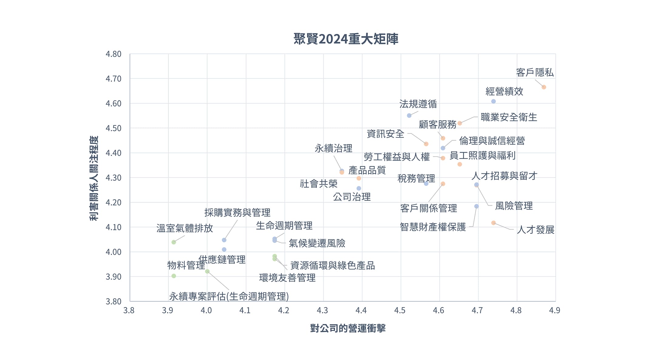 聚賢已依 GRI 2021 準則之揭露規範於永續報告書相應章節依序揭露這 11 項重大議題的管理方針和相關資訊,以供各利害關係人參考。本公司將 2024 年度辨識出的結果進一步納入 ESG 政策、推動策略及長期永續目標中,確保永續發展方針得以全面落實, 持續推動企業穩健成長。