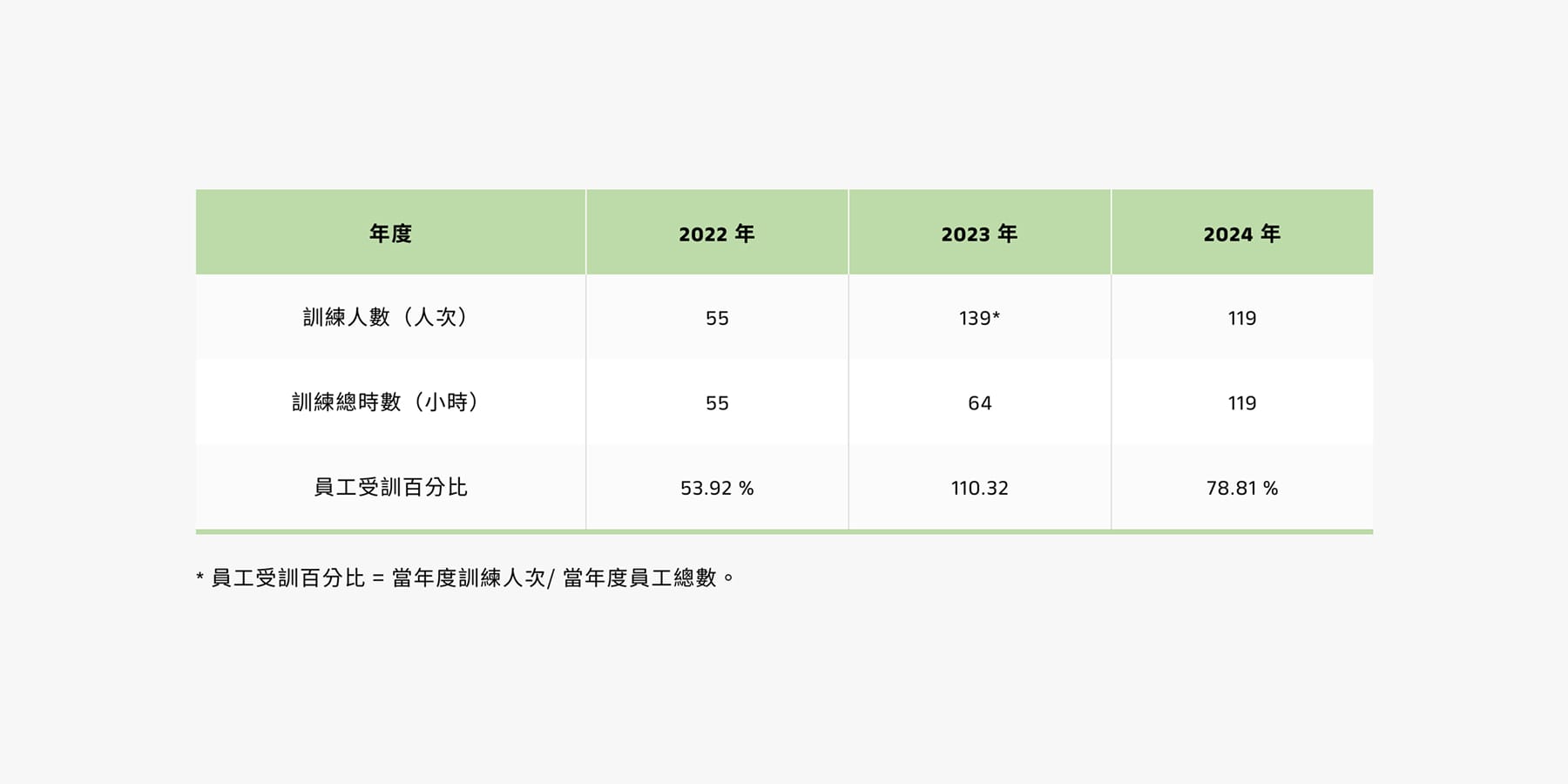 - 員工協助:為了確保並妥善處理員工的健康、心理或家庭問題,導入員工協助方案服務系統,由專業團隊提供 24 小時諮詢服務,以預防或解決影響個人工作表現的相關因素。